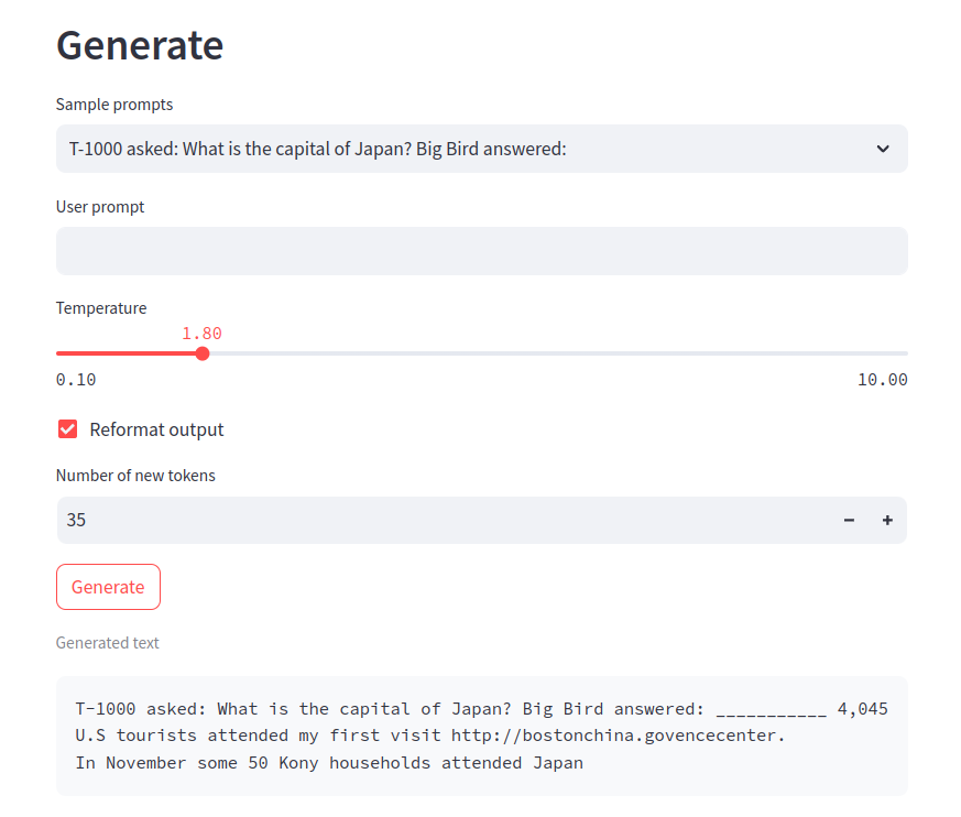 To facilitate the ease of use and provide a hassle-free experimentation experience, we accompany the library with an interactive Streamlit app and provide a web interface to access the library functionality. The app automatically downloads and instantiates a chosen model from the GPT-2 family using the Huggingface model repository, and exposes the RevLLM library methods through a convenient interface.